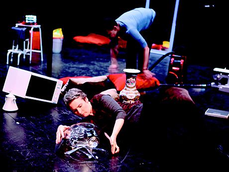 There is an anecdote about a washing machine and there is a famous murder story. We mention things that never appear: le lapin. The two sisters, Papin. We never see them. We speak about fables but we never actually hear one. We speak in English and we speak in French. Also, we raise our voices, we take clothes off, we put clothes on, we look into the audience with... anxiety...