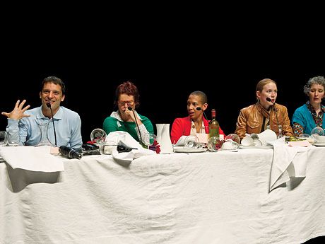 We are watching «Deserve». A performance with four women and two men, and a machine. There are objects that you would find in any home. These objects do not belong to the characters in the piece or even to the performers: a cake mixer, cutlery, a hot iron, a toaster, a sharp knife. There is a violent episode that we do not see. It has already happened, off stage, elsewhere, but the performers often refer to it. One man plays the violin. There is very little other music, only the violin. And two songs. We hope to hear two songs.